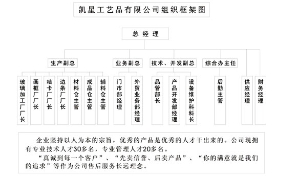 义乌市凯星工艺品有限公司座落在素有华夏第一市之称的中国小商品城-义乌。公司从2002年成立至今已有近10年的发展历程,总建筑面积2万平方米,拥有员工200人。专业生产各类高中底档塑料PS发泡、木制、塑制相框、画框、镜框,PS线条, 墙贴镜及GT玻璃相框,时钟框等,公司全引进意大利、英国、台湾等世界一流设备作质量保证。是目前义乌上规模的相框制造、销售企业之一。